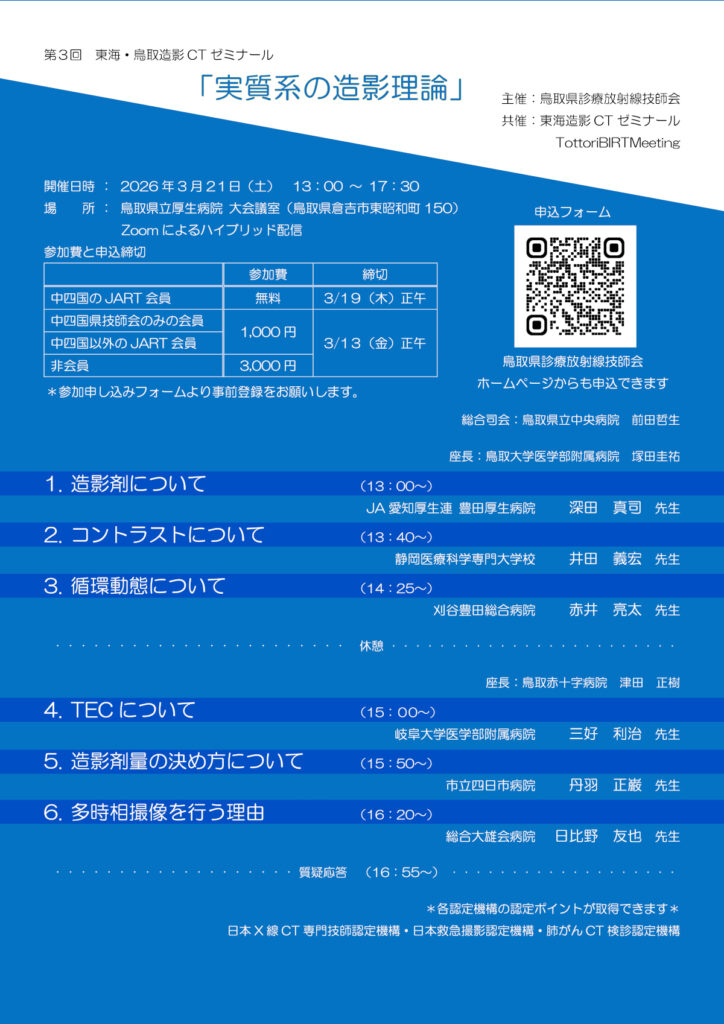 2026年3月21日(土)に第3回 東海・鳥取造影 CT ゼミナールを鳥取県立厚生病院 大会議室+Zoomハイブリッドにて開催いたします。